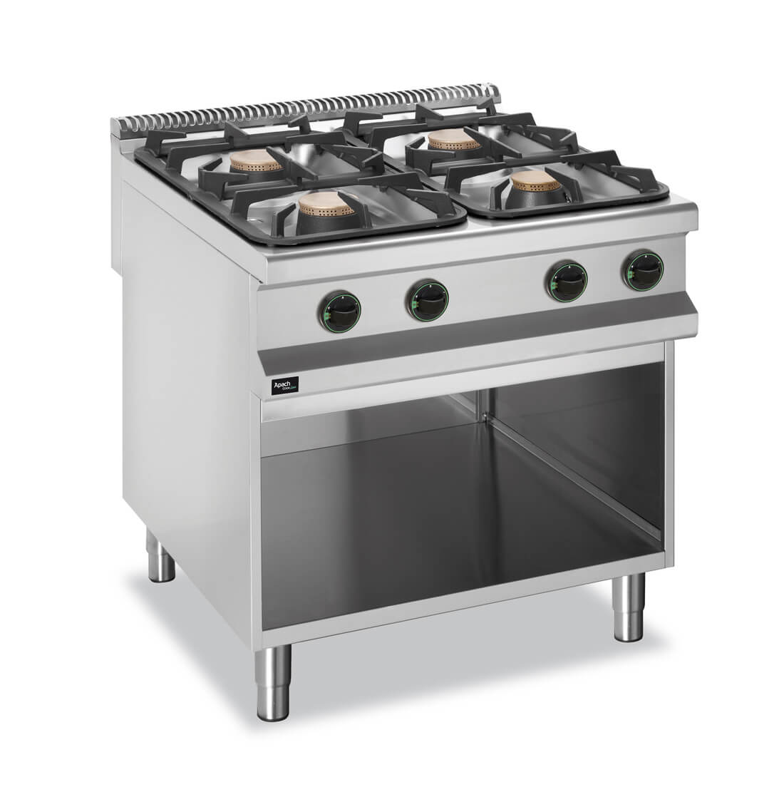 APACH 900 SERIES 4 BURNERS RANGE GAS APRG-89P with an open stand allows to cook dishes with the help of burners or a gas oven. A professional gas stove is equipped with removable burners with piezoelectric ignition and flame holder as well as with a sealed molded tabletop The stove APACH APRG-89P is equipped with an electromechanical control panel. The kit includes nozzles that allow you to reconfigure the equipment on the gas cylinder.