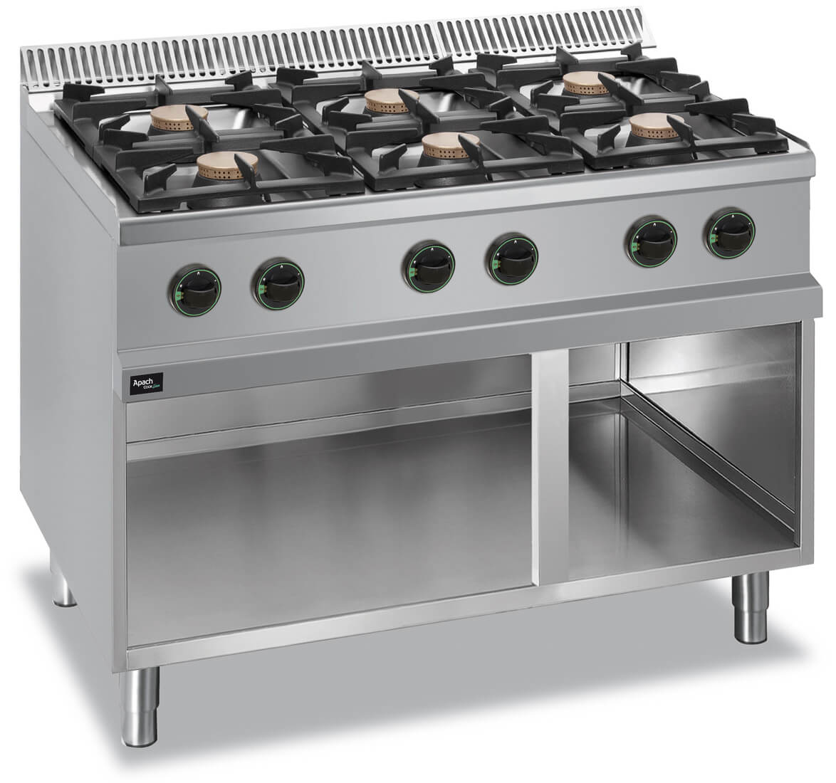 APACH 700 seeria 6 põleti vahemikuga gaas APRG-117P on mõeldud kala, liha, linnuliha ja muude toodete kuumtöötlemiseks. Suur hulk põleteid võimaldab kokal oma tootmisvõimsust suurendada. Lisaks saab seda plaadimudelit kasutada toitlustuses: nii eraldi kui ka koos teiste APACH-seeria termomoodulitega. Ahi APACH APRG-117P on varustatud elektromehaanilise juhtpaneeli ja vormitud lauaplaadiga. Korpus on valmistatud roostevabast terasest. Gaasipõletid on valmistatud emailitud malmist ja on eemaldatavad. Igal neist on eraldi malmist rest. Lisaks on pilootkaitsega põleti ja leegi hoidja. Küpsetuspinna all asub avatud alus. See mudel ei ole varustatud ahjuga. Komplekt sisaldab düüse, mis võimaldavad seadmeid gaasiballooni ümber seadistada. APACH APRG-117P põranda gaasipliidil on reguleeritavad jalad. Ahju mõõtmed: 1100х700х850 mm. Professionaalne gaasipliit on varustatud kuue 7 kW võimsusega põletiga. Gaasi koguvõimsus on 42 kW.