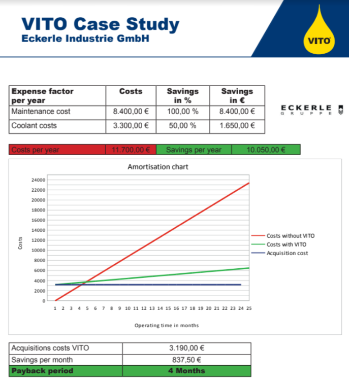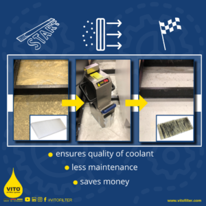 Kasutades tselluloosifiltrit, eemaldab VITO patenteeritud surve-pumpamise meetodil filtreerides kõik tükid, laastud ja tahked osad teie emulsioonist, õlist, vesilahusest või pesemisvannist. Lisaks takistab filtreerimisprotsess bakterite ja seente teket. Mehaaniline mikrofiltreerimine võtab aega vaid paar minutit.
