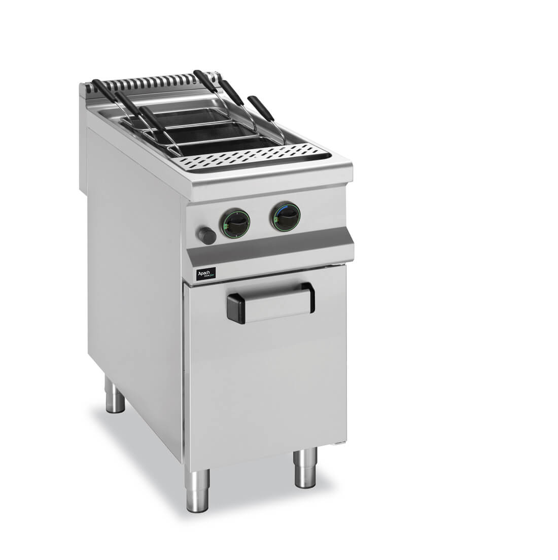 PASTAKEETJA 900 SEERIA APACH APPF-49P – gaasiga töötava Pastakeetja tööstuslikul põrandamudelil on mitmekülgne ja säästlik agregaat, mis on loodud spagettide, ravioolide, riisi, vareenikute ja pelmeenide keetmiseks. See mudel on varustatud gaasipõletitega, millel on isetoimiv leegi püsivana hoidmise seade ja süüde. Elektromehaanilist juhtimissüsteemi on lihtne kasutada ja see ei vaja erilisi oskusi. Mudel sobib kohvikutele, pitsarestoranidele ja restoranidele. Agregaadi kere ja mahukas 40-liitrine vann on valmistatud roostevabast terasest. Keetmise annuskorvid hangitakse eraldi ja tarnekomplekt sõltub ettevõtte menüüst. Pastakeetja välismõõdud on 400×900×850 mm. Suurim tarbitav gaasivõimsus – 14 kW. Seadme kogukaal on 44 kg.