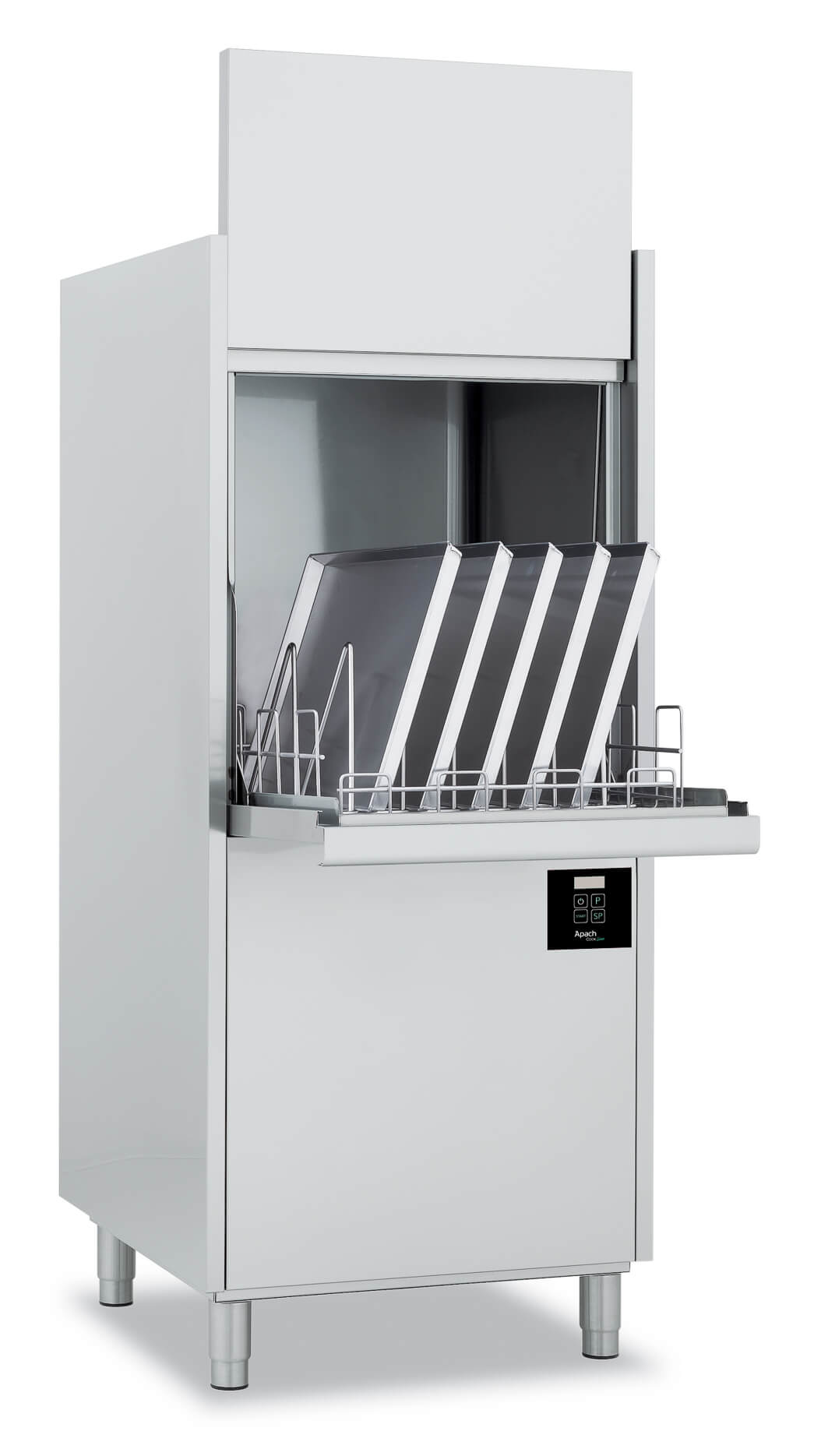 MASIN KATELDE PESEMISEKS APACH AK 901 ette nähtud katelde, kandikute, kööginõude, küpsetusplaatide, pakendite – sealhulgas plastikust pesemiseks. Soovitatakse kasutada lisaseadmena suurtes toitlustusettevõtetes, samuti pagaritöökodades, piima- ja lihatootjatel ning suurpoodides. Eripärad: – Laadimisakna kõrgus 650 mm – 3 pesutsüklit: 2, 4 ja 8 min – Topeltkere ja pesemisvoolikud on valmistatud kõrgekvaliteetsest roostevabast terasest AISI 304 – Vormi pressitud valamu ja keevisliidete puudumine parandavad tervishoiulisi näitajaid – Talitlus Thermostop tagab loputamise kasutaja poolt määratud temperatuuril – Kasutaja jõu säästmiseks on esiuks jagatud 2 osaks ja kujundatud nii, et moodustab avamisel lauaplaadi korvide peale- ja mahalaadimiseks – Tänu patenditud pumbale, erilistele pihustitele ja topeltvoodrile on mudel töötades eriti vaikne. – Valida on võimalik ka sisseehitatud pesu- ja loputusainete annustitega mudeleid. Täiendavad omadused: Pesukorvide mõõt: 550×610 mm 1 tsükli veekulu – 4 l