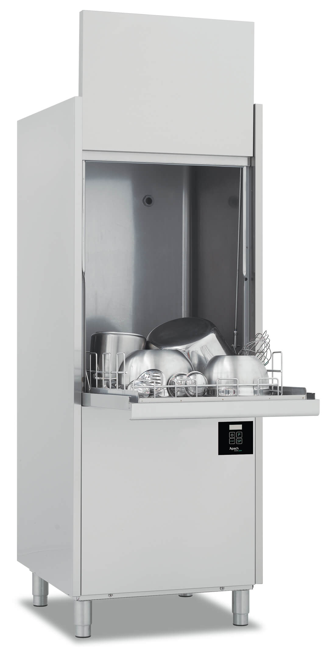 MASIN KATELDE PESEMISEKS APACH AK 902 kasutatakse katelde, kandikute, kööginõude, küpsetusplaatide, pakendite, sealhulgas plasti, pesemiseks. Kasutatakse laialdaselt suurtes toitlustusettevõtetes ja kaubandusasutustes. Aparaadi topeltkere ja pesemisvoolikud on valmistatud roostevabast terasest AISI 304. Pesutsükkel võib kõikuda 2 kuni 12 minutini. Mudel on varustatud talitlusega UltraRinse, mis tagab loputamise ajal pideva temperatuuri ja surve ning isepuhastumise talitlusega. Esiuks on jagatud 2 osaks ja kujundatud nii, et moodustab avamisel lauaplaadi korvide peale- ja mahalaadimiseks. Tänu patenditud pumbale, erilistele pihustitele ja topeltvoodrile on mudel töötades eriti vaikne. Laadimisakna kõrgus – 850 cm Pesukorvide mõõtmed on 560х630 mm. Ühe pesutsükli jooksul kasutab masin 3 liitrit külma vett. Paagi maht — 40 l. Masina välismõõtmed on 720x780x1960 mm. Ühendatakse 380 V võrguga. Suurim tarbitav võimsus – 10.5 kW. Kogukaal on 148 kg.